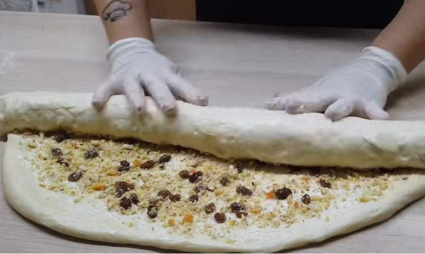 Απο πάνω ρίχνουμε το τους τριμμένους ξυρους καρπούς(κρατάμε λίγους για από πάνω) και τυλίγουμε από την μια άκρη σε ρολό.