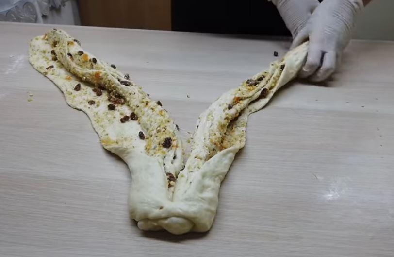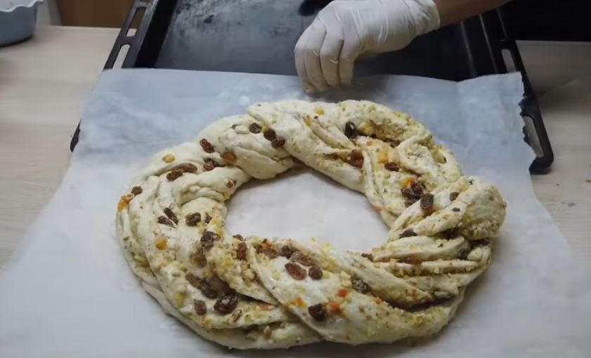Ενώνουμε τις 2 άκρες της κοτσίδα πάνω σε ένα φύλλο ψησίματος και τον βάζουμε στο ταψί