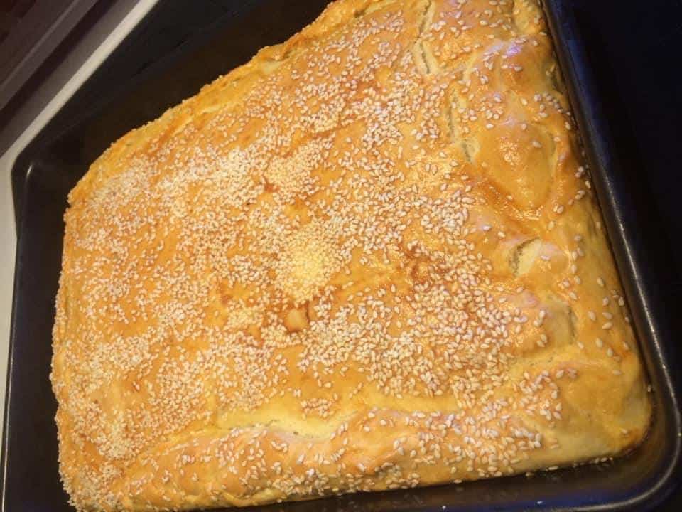 Άλειψε την επιφάνεια με το χτυπημένο αυγό και πασπάλισε με σουσάμι.