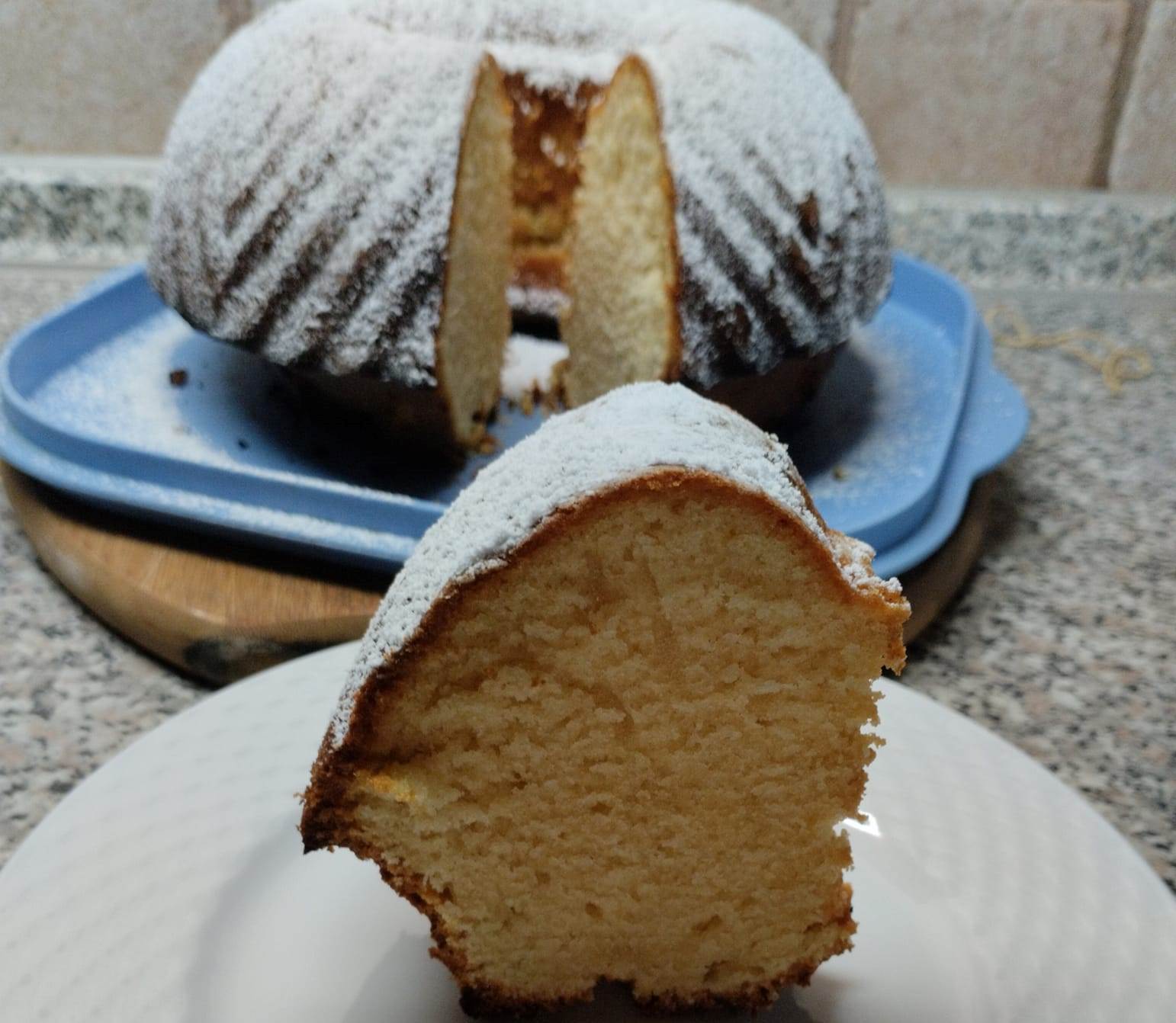 5. Αφήνουμε για 10 λεπτά το κέικ να κρυώσει. Ύστερα, το ξεφορμάρουμε σε πιατέλα και σκεπάζουμε με αχνη ζαχαρη αφού κρυώσει εντελώς.