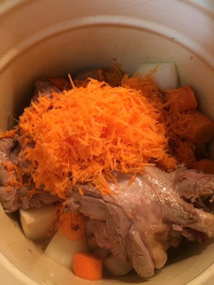 Σε μια κατσαρόλα τσιγαρίζουμε το αρνί, προσθέτουμε το κρεμμύδι ψιλοκομμένο και τρίβουμε τα καρότα, δύο από τα οποία είναι τριμμένα.