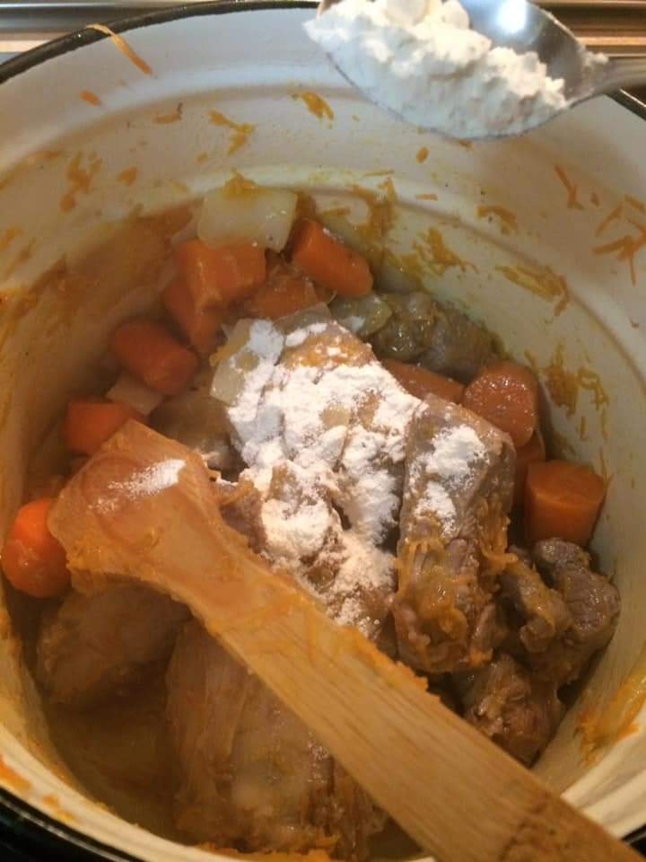 Τηγανίζουμε τα προϊόντα για περίπου 5 λεπτά και μετά προσθέτουμε αλεύρι, νερό, αλάτι,