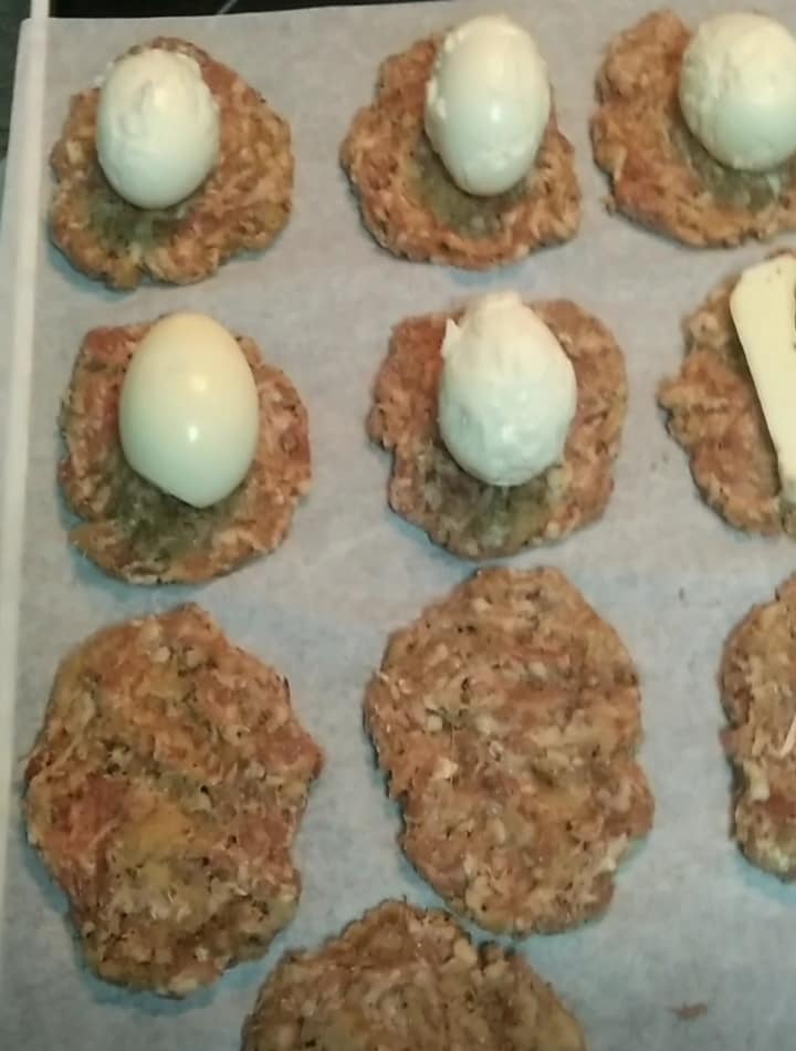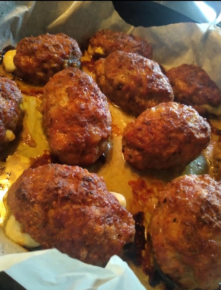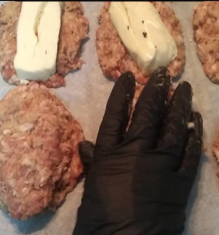 Ζυμώνω πολύ καλά και πλάθω μπιφτέκια βάζω στα μισά μπέικον βρασμένα αυγά χαλούμι