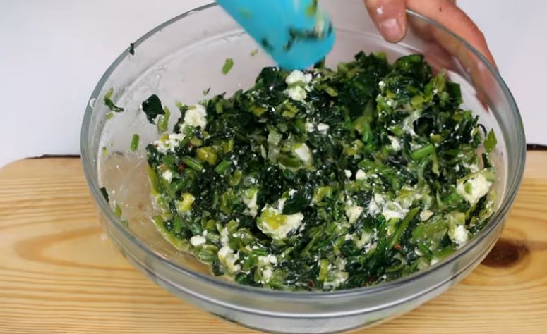 Στη συνέχεια έβαλα τα χόρτα σε ένα μπολ και έριξα το τυρί και ανακατεψα και αφησα στην άκρη