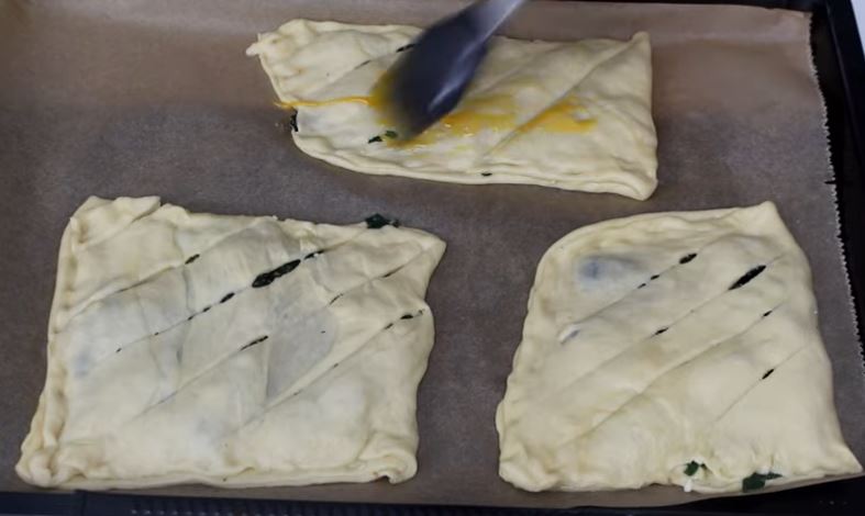 Πριν τα σφραγίσετε, βρέξτε τις άκρες της ζύμης με κρόκο αυγού, ώστε να σφραγίσουν κατά το ψήσιμο.