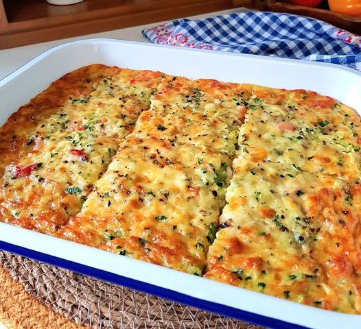 Από πάνω σκορπίζουμε τα κολοκυθάκια και περιχύνουμε με το μείγμα των αυγών.