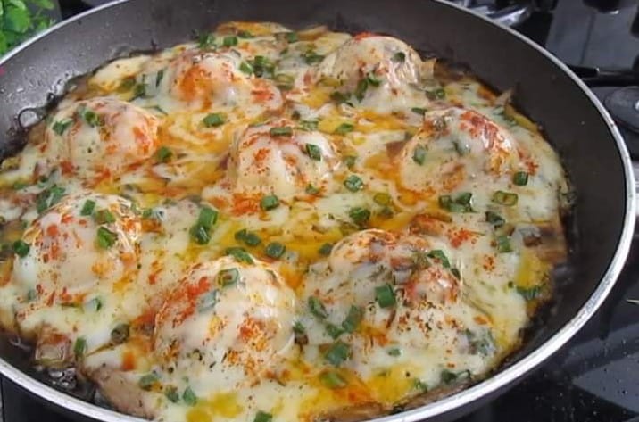 Συναρμολόγηση: Ρίξτε τη σάλτσα πάνω από τα σοταρισμένα λαχανικά στο τηγάνι. Προσθέστε τα κομμένα στη μέση αυγά, το ψιλοκομμένο φρέσκο κρεμμύδι, την πάπρικα, το θυμάρι, ρίγανη και αλάτι. Πασπαλίστε με το τριμμένο τυρί και σκεπάστε το τηγάνι με καπάκι.
