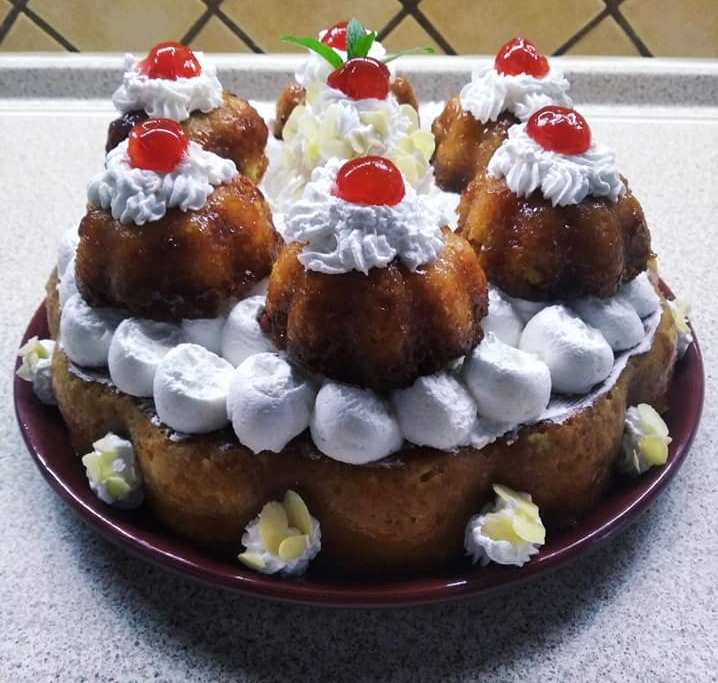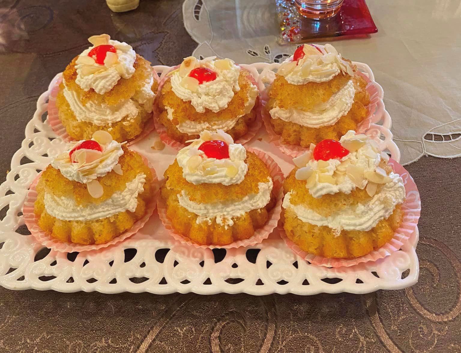 Τοποθετούμε πάνω σε αυτό τα μπαμπαδάκια μας, βάζουμε λίγη σαντυγι στις κορυφές τους και στολίζουμε με γλυκό κεράσι, αμύγδαλο φιλέ και λίγο δυόσμο!!!