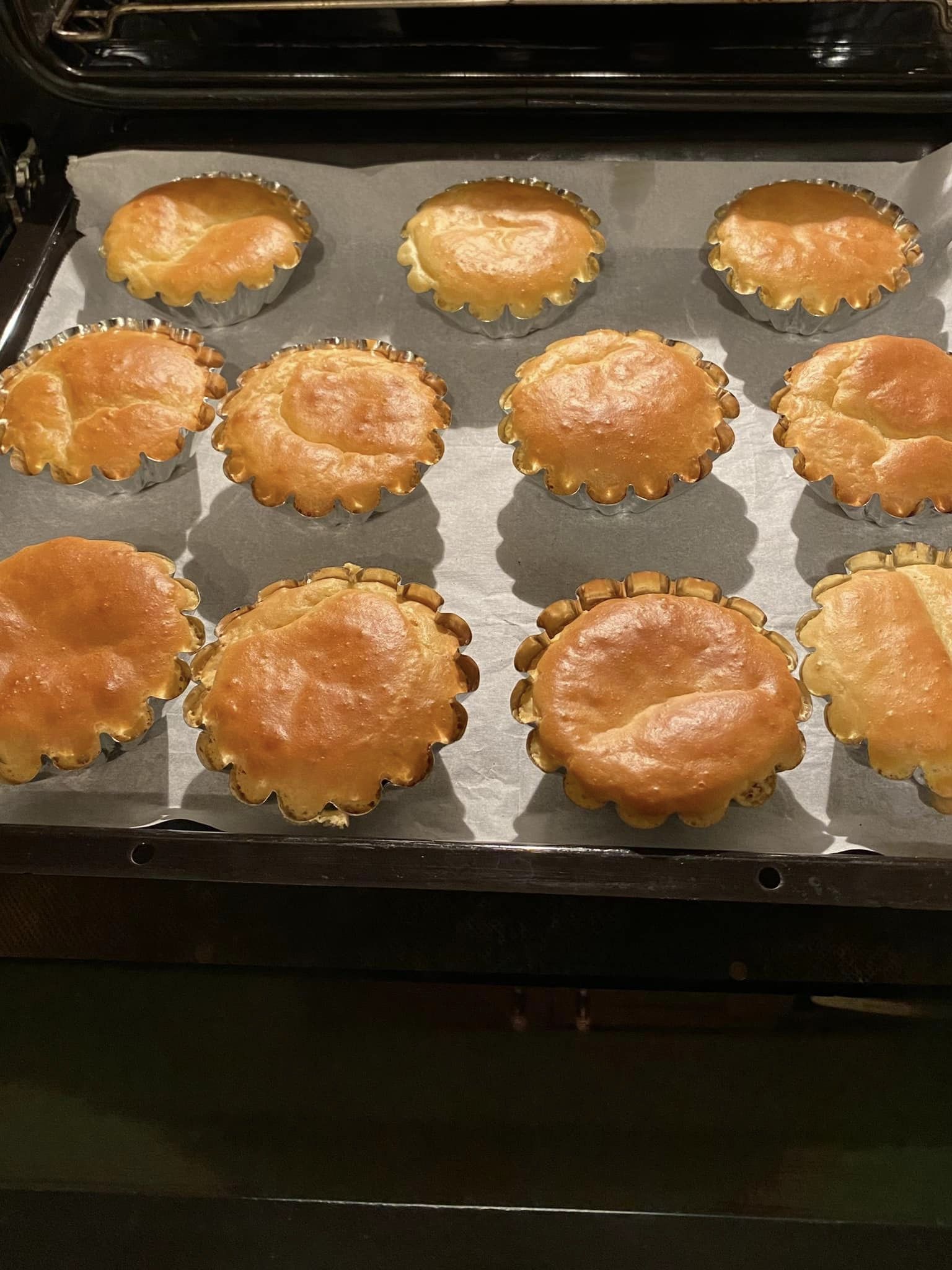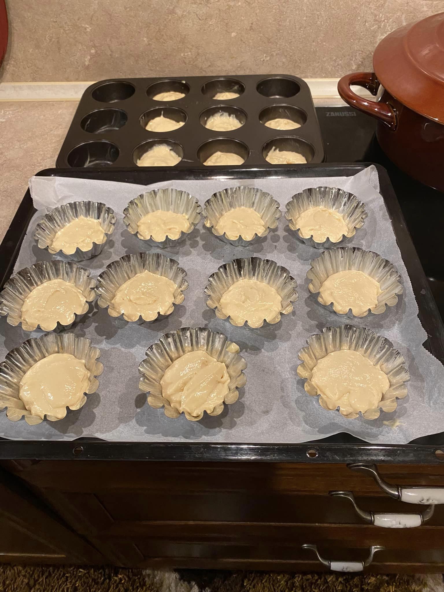 Βάζουμε σε κάθε θήκη ένα κ.σ. μίγμα και αδειάζουμε το υπόλοιπο στο ταψακι τα σκεπάζουμε με μεμβράνη και με πετσέτα και τα αφήνουμε σκεπασμένα για μια ώρα να φουσκώσουν.Στη συνέχεια τα ψήνουμε σε προθερμαμενο φούρνο στον αέρα στους 170 βαθμούς μέχρι να ροδησει περίπου 40 λεπτά.