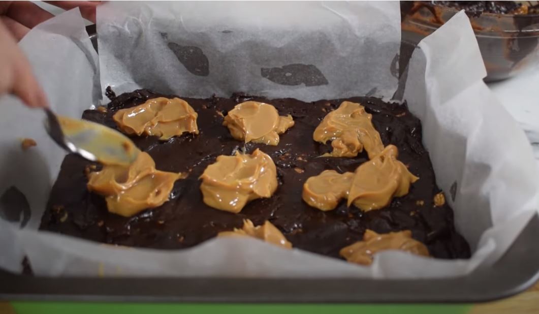 Απλώστε το μισό από το μείγμα σοκολάτας στο κάτω μέρος του ταψιού.