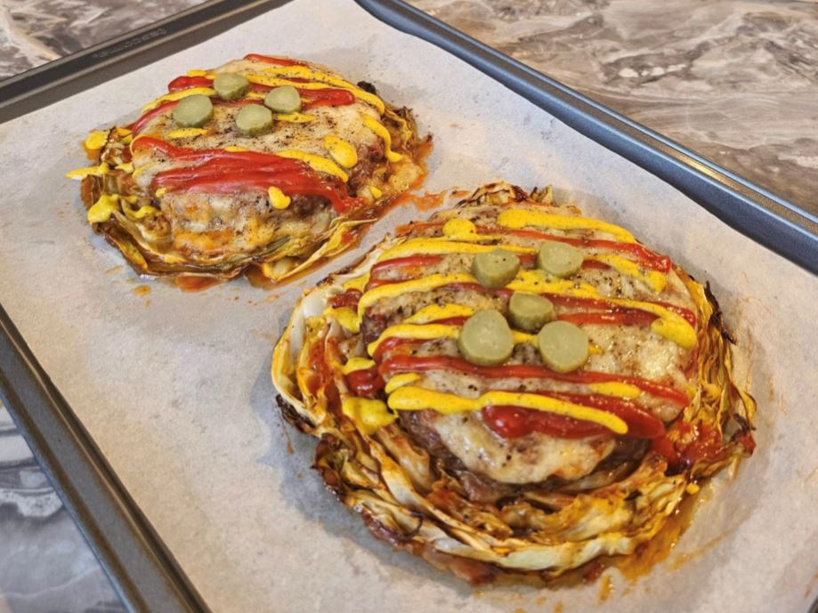 Ανακαλύψτε τα Burger σε Λαχανόφυλλα στο Φούρνο, μια μοναδική, υγιεινή και low-carb συνταγή που αντικαθιστά το ψωμάκι του burger με ζουμερή φέτα λάχανου! Φτιάχνουμε λαχταριστά μπιφτέκια Angus, τα ψήνουμε πάνω σε μαλακό λάχανο με μοτσαρέλα και σάλτσα ντομάτας, προσφέροντας ένα γεύμα που είναι τόσο απολαυστικό όσο και θρεπτικό.
