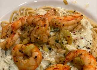 Έφτιαξα μια σάλτσα κρέμας με πέστο και παρμεζάνα με γαρίδες jumbo σοταρισμένες σε κρεμμύδια και σέλινο, και...
