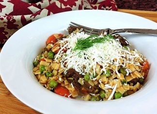 2 μεγάλες πιπεριές κομμένες σε φέτες, χρησιμοποίησα 1 κόκκινη και 1 κίτρινη πιπέριες