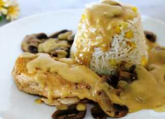 Λαχταριστό κοτόπουλο με σάλτσα λευκού κρασιού, μανιτάρια και ρύζι