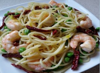 Σπαγγέτι με φρέσκo αρακά, λιαστές ντομάτες και γαρίδες
