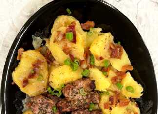 Ζεστή πατατοσαλάτα με μπριζόλες στο τηγάνι