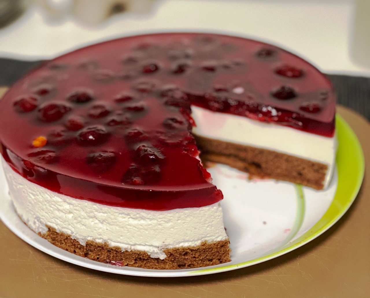 Αυτό το κέικ είναι πραγματικά μια γαστρονομική απόλαυση: αφράτο παντεσπάνι, ντελικάτη μους και η ξινή γεύση των κερασιών. Ένα πολύ νόστιμο καλοκαιρινό κέικ. Σας εύχομαι επιτυχημένο ψήσιμο!