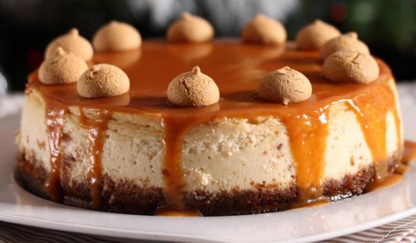 Όταν το μείγμα γίνει ομοιογενές, ρίξτε την τελική καραμέλα σε ένα βάζο ή κύπελλο. Να θυμάστε ότι πήζει πολύ αργότερα. Συναρμολογήστε το cheesecake προσθέτοντας κρέμα στην βάση μπισκότων, αφήστε το στο ψυγείο να σκληρύνει για 30 λεπτά και ρίξτε τη σάλτσα καραμέλας. Για διακόσμηση, κανονίζουμε μερικές καραμέλες ζαχαρωτών και πασπαλίζουμε με σοκολάτα γάλακτος όπως επιθυμείτε.