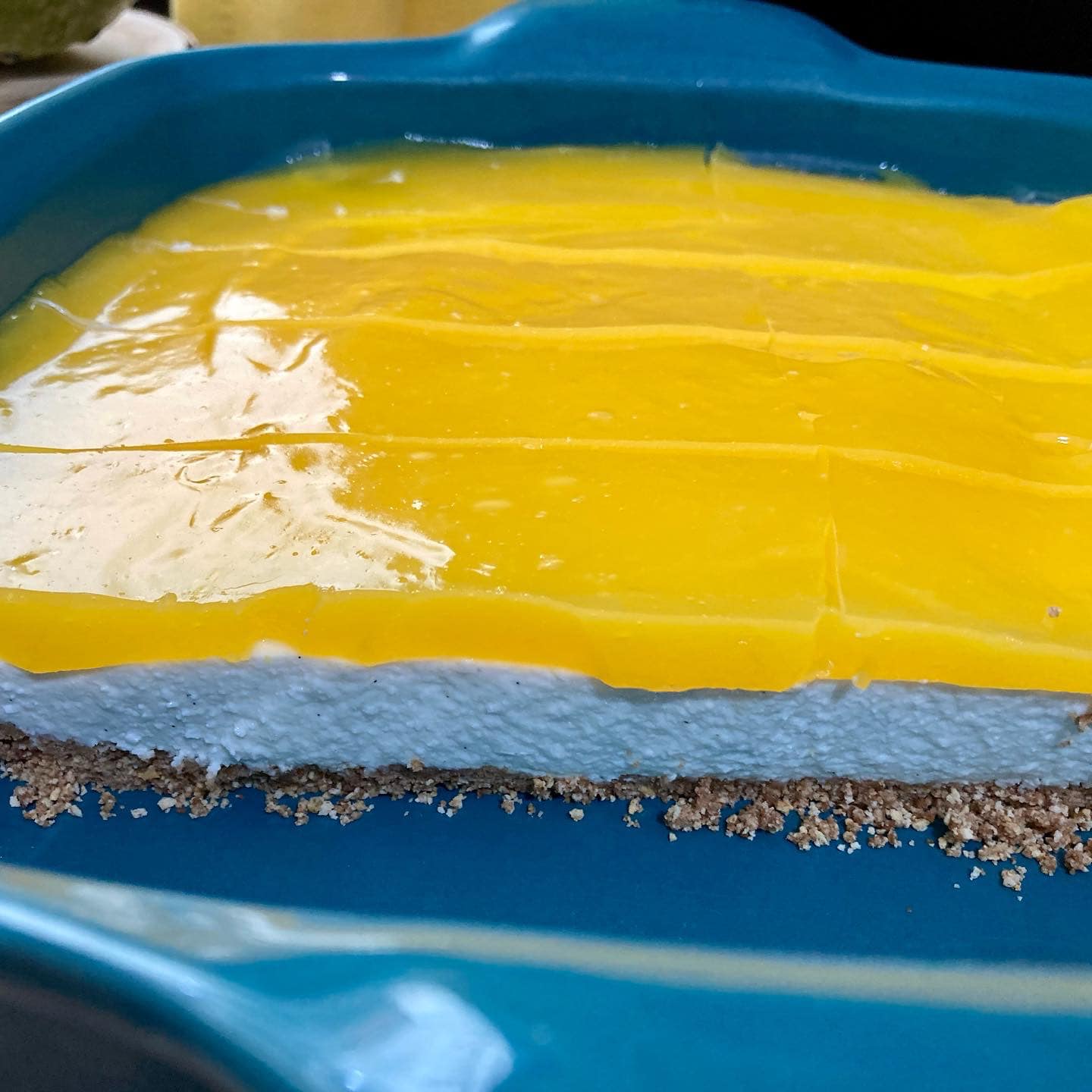 Όταν το ζελέ έφτασε σε θερμοκρασία δωματίου, το έριξα πάνω από το τυρί κρέμα, ισοπεδώνοντάς το ελαφρά με μια σπάτουλα και μετά ξαναβάζω το ταψί στο ψυγείο για άλλες 4-5 ώρες πριν το σερβίρω.