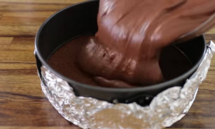 Τοποθετήστε τη φόρμα σε ένα ταψί. Τοποθετήστε το ταψί στο φούρνο. Ρίξτε βραστό νερό να φτάσετε  μέχρι τη μέση της φόρμας.