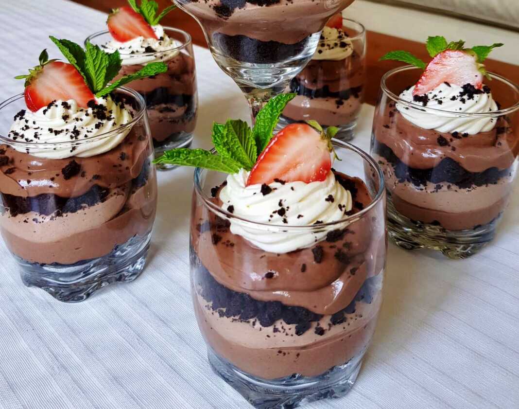 Μοιράζουμε ομοιόμορφα τη μισή ψίχα μπισκότου σε 6 ποτήρια.