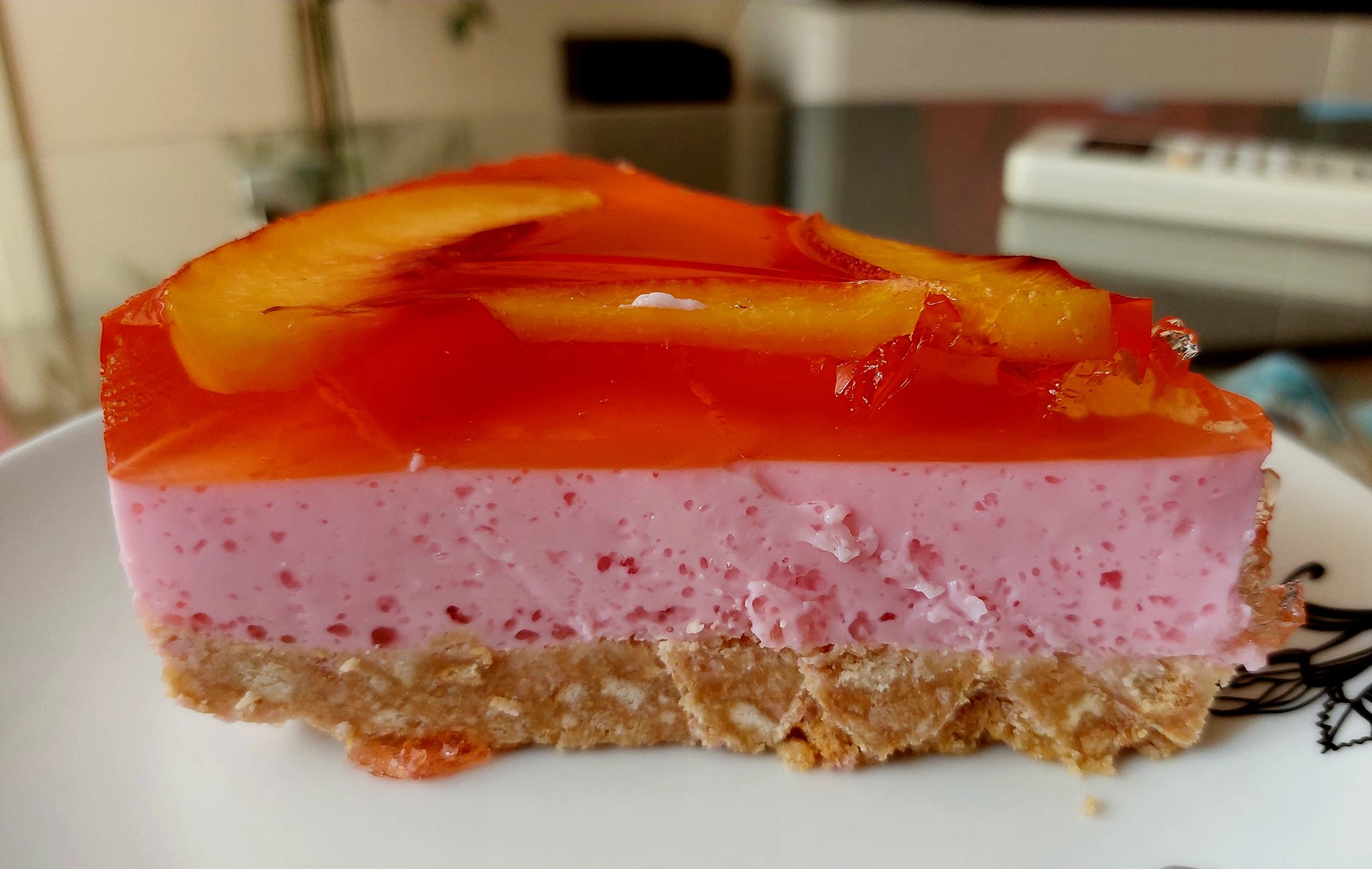 Αφήνουμε το ζελέ για 1 ώρα στην άκρη, μέχρι να κρυώσει. Το απλώνουμε πάνω από την κρέμα γιαουρτιού σιγά σιγά με μία κουτάλα τοποθετούμε και τα νεκταρίνια σε φέτες