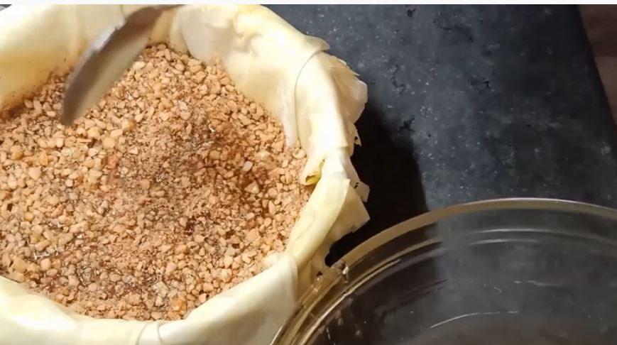 Βάζουμε περίπου τα 3/4 του μείγματος καρυδιού πάνω από τη βάση και ρίχνουμε περίπου 6 κουταλιές της σούπας σιρόπι.