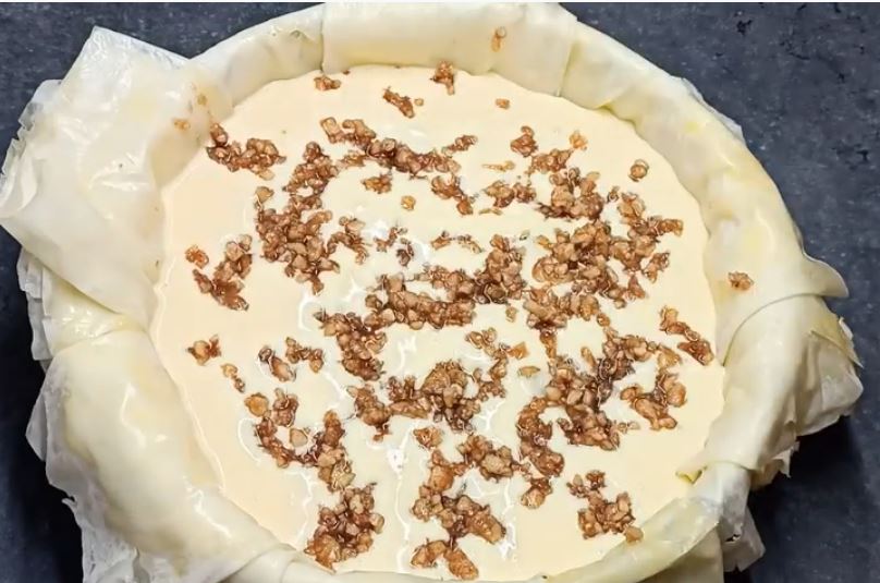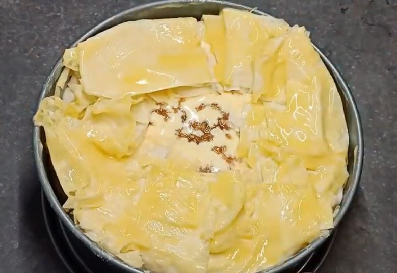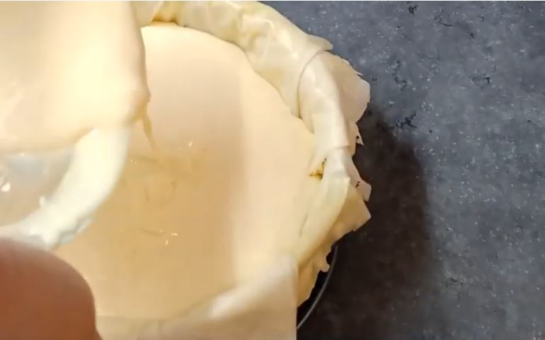 . Μεταφέρετε τα φύλλα στην βουτυρωμένη φόρμα (τσερκι) με τις άκρες να κρέμονται πάνω από τις πλευρές.