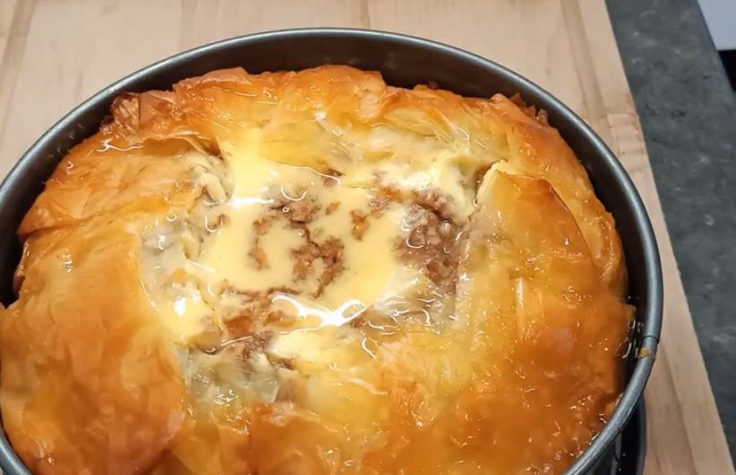 Μετά από 50 λεπτά, αφαιρέστε το cheesecake μπακλαβά από το φούρνο και ρίξτε αμέσως το σιρόπι.