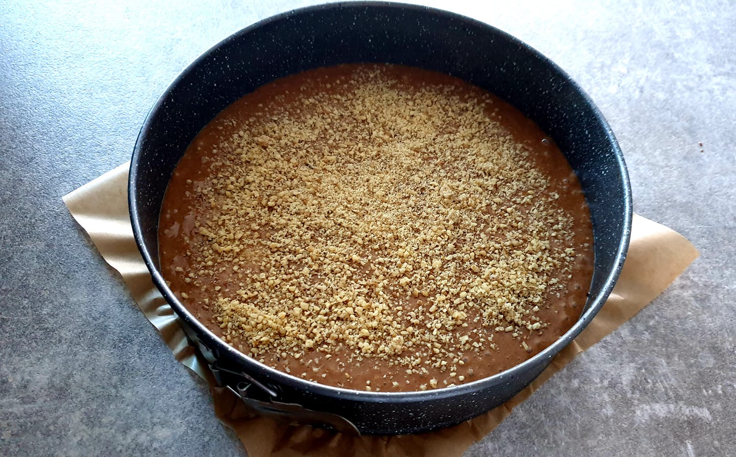 Σε ένα ταψί, στο οποίο έχουμε τοποθετήσει προηγουμένως χαρτί ψησίματος, ρίχνουμε το μείγμα, στο οποίο στη συνέχεια πασπαλίζουμε τα υπόλοιπα καρύδια.