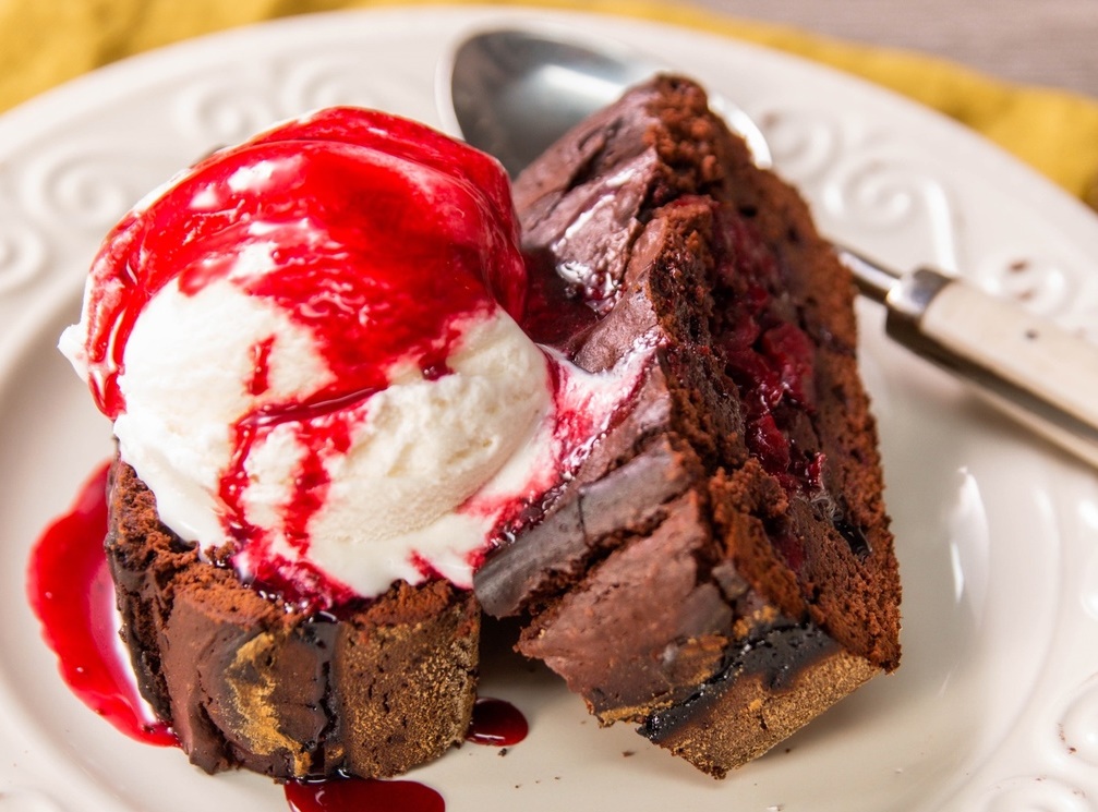 * Τοποθετούμε ένα κομμάτι μπράουνι σε πιατέλα σερβιρίσματος, σερβίρουμε με μια μπάλα παγωτό και από πάνω ρίχνουμε σιρόπι κεράσι.