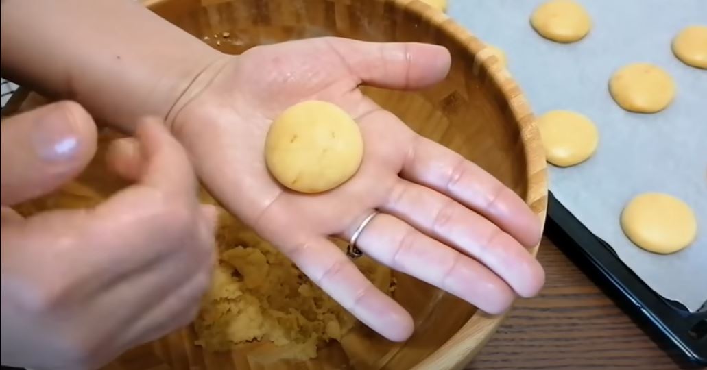Τα τοποθετούμε σε ταψί στο οποίο έχουμε βάλει αντικολλητικό χαρτί.