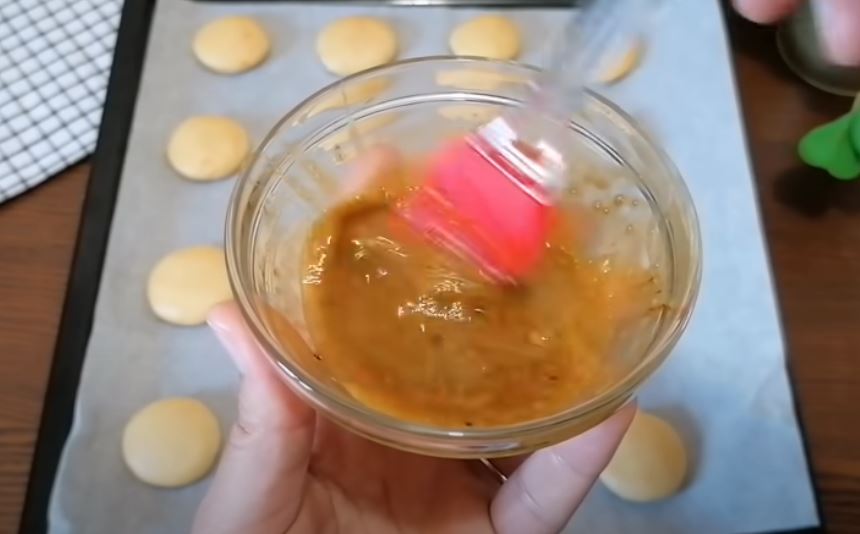 Ρίχνουμε σ ένα μπολάκι τον κρόκο μ ένα κουταλάκι του γλυκού νες καφέ το χτυπάμε να λιώσει και μ αυτό αλείφουμε ένα ένα τα μπισκότα μας.