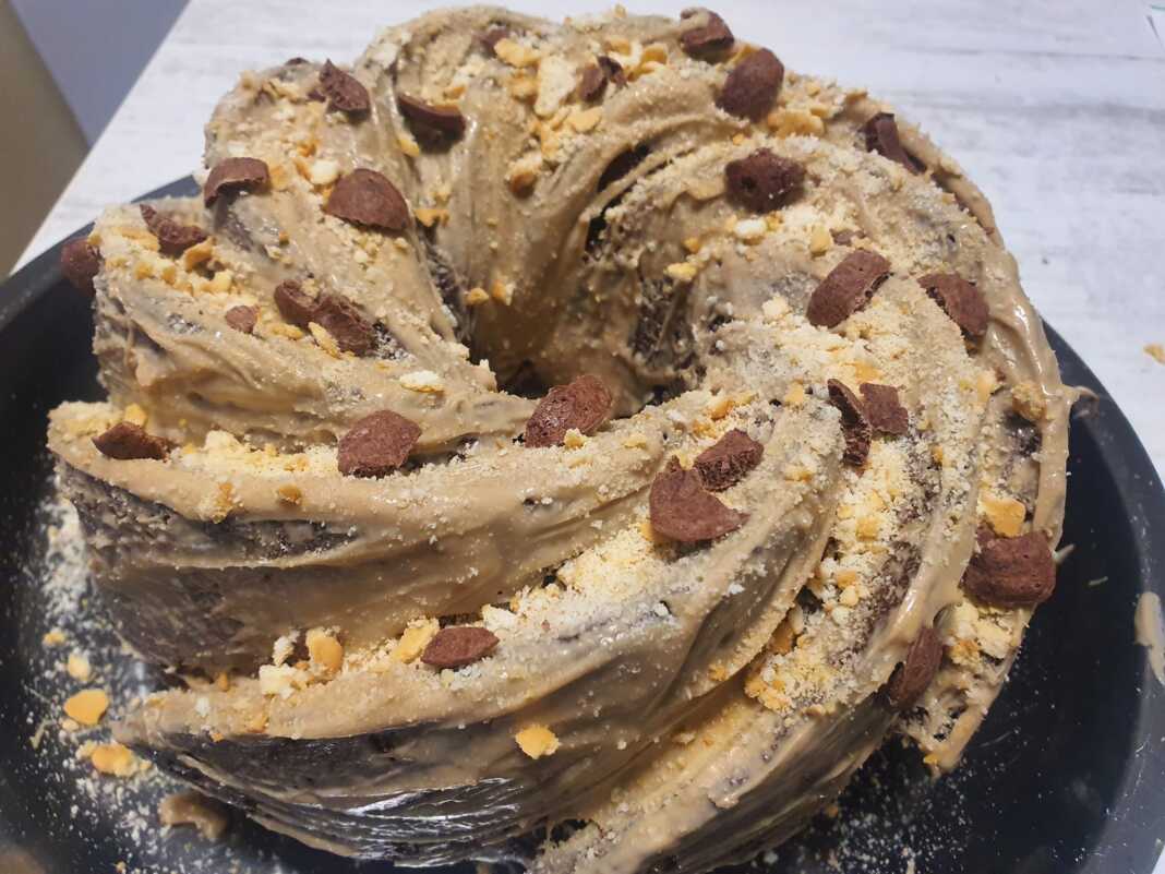 Ανακάτεψα τις δύο σοκολάτες για το γλάσο και τις έλιωσα στο φούρνο μικροκυμάτων. Τα ανακάτεψα καλά και άπλωσα το κέικ.
