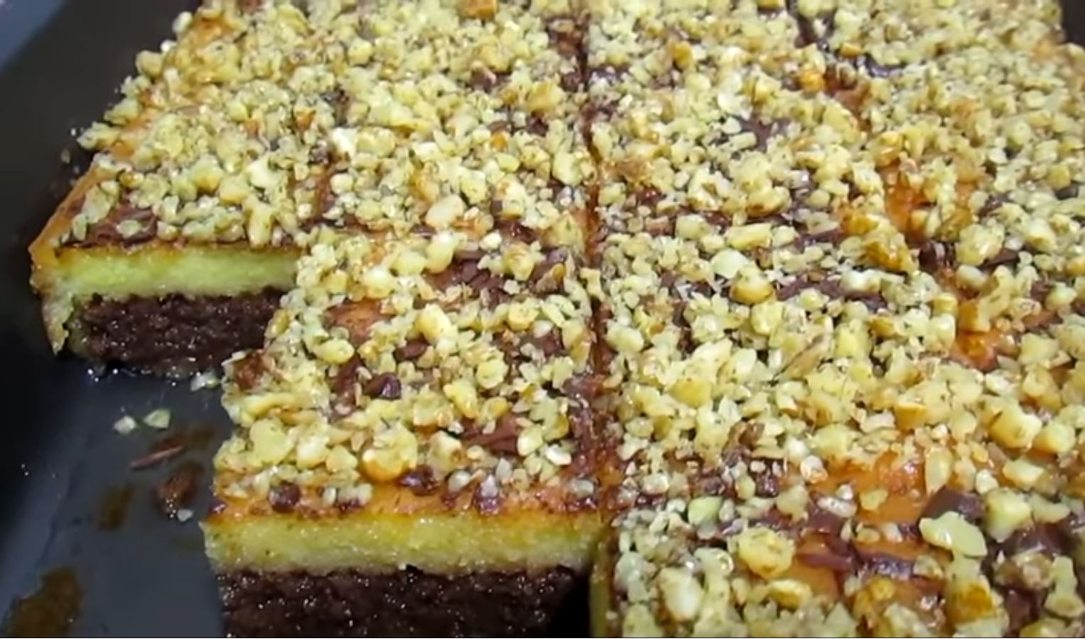 Σε ένα μπολ ρίχνουμε τ αυγά , ζάχαρη και χτυπάμε με ένα μίξερ χειρός και σε λίγο ρίχνουμε το αλεύρι, σιμιγδάλι, καρύδια, κακάο ενώ χτυπάμε σε κάθε υλικό που ρίχνουμε.
