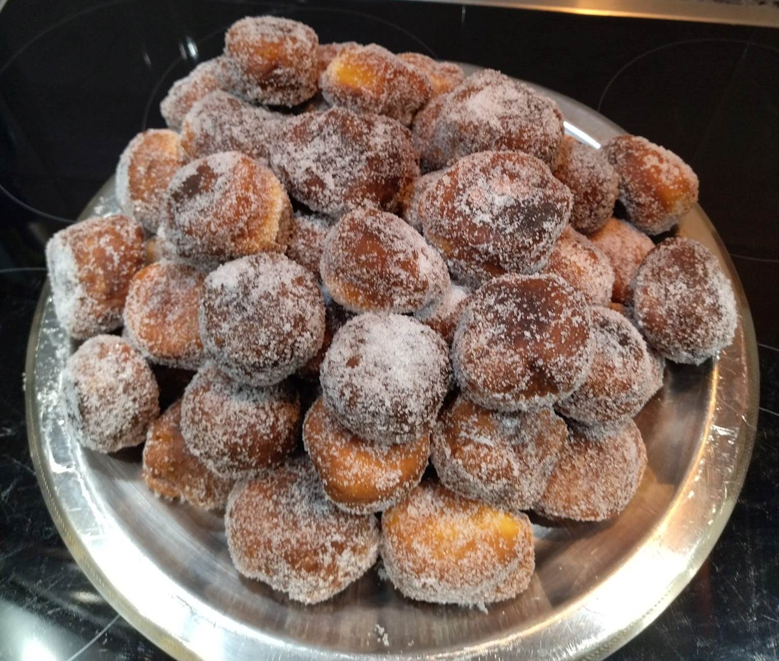 Αφήνουμε μία ώρα να φουσκώσει ανοίγουμε το φύλο πάχος 1 εκατοστού κόβουμε με κουπάτ κύκλους 5 εκ τ αφήνουμε 1 ώρα να φουσκώσουν και τηγανίζουμε