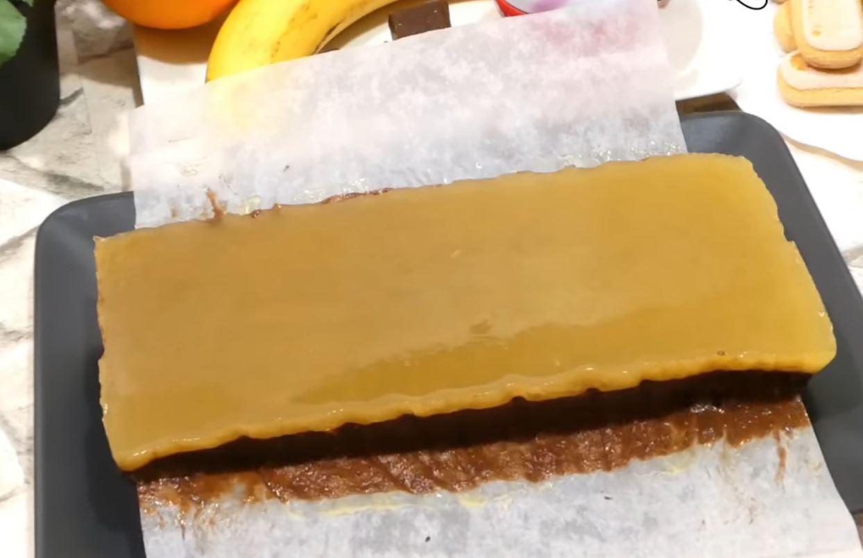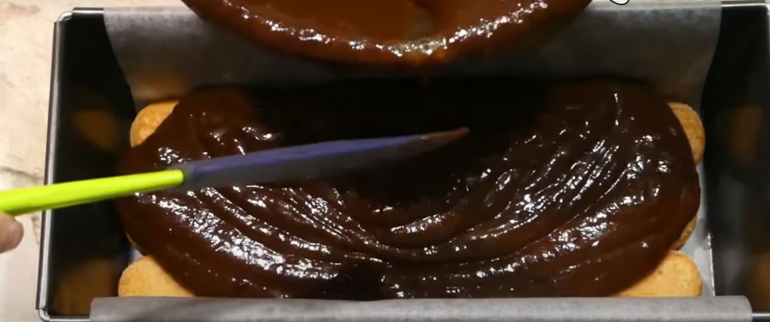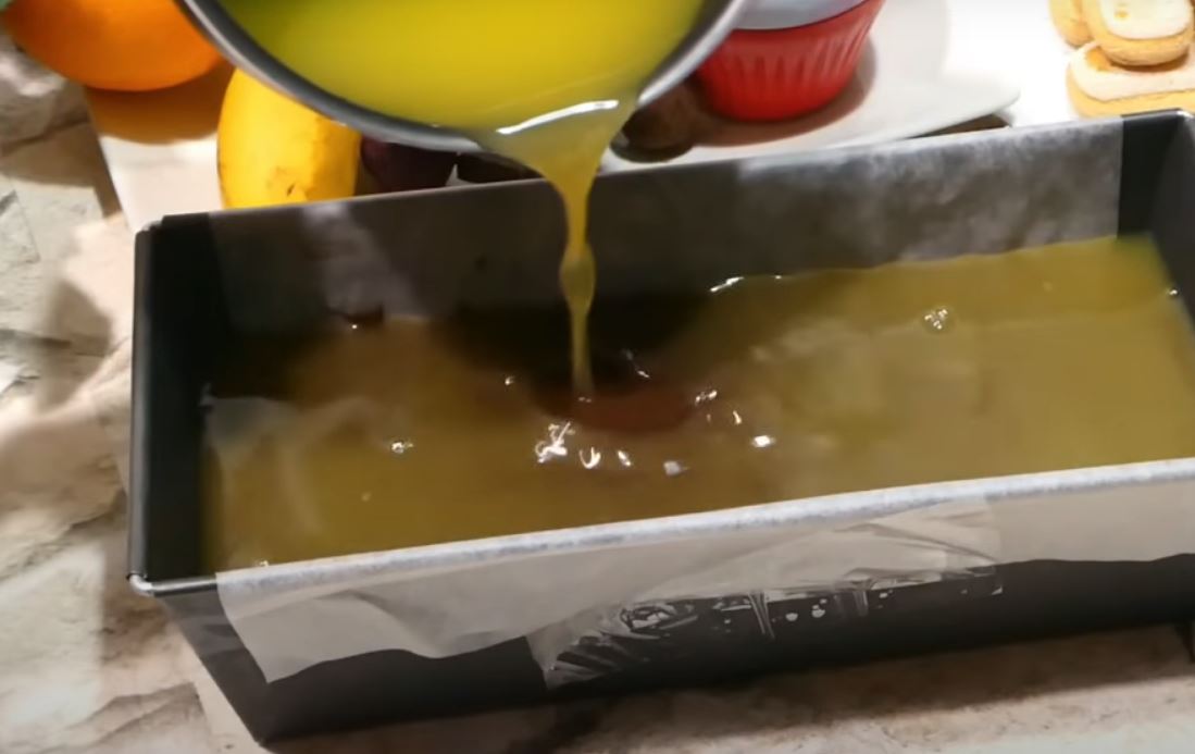 Βουτάμε τα σαβουαγιάρ στον χυμό να μαλακώσουν και τα στρώνουμε σε μικρή φόρμα του κέικ μακρόστενη στην οποία έχουμε βάλει αντικολλητικό χαρτί.