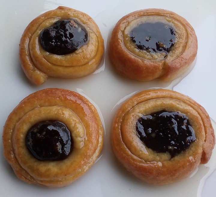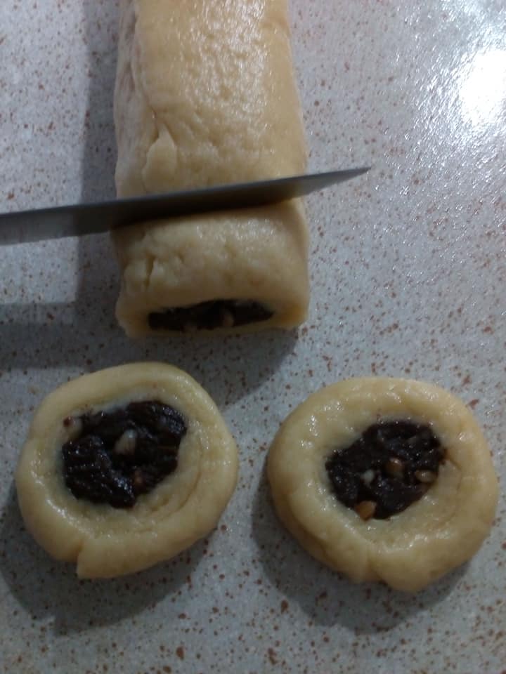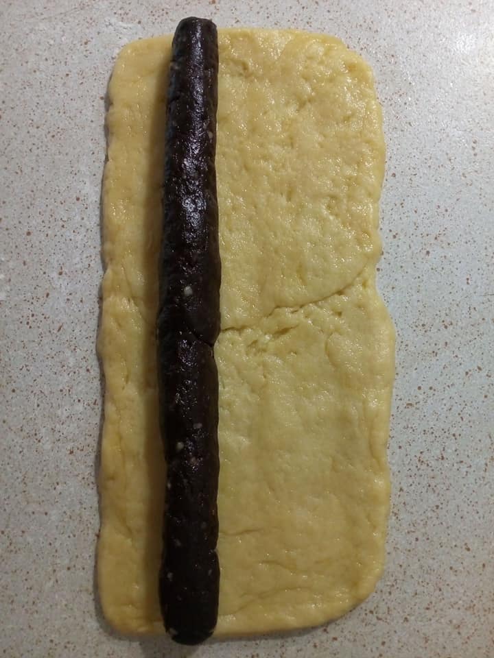 Βάζουμε στη άκρη της άσπρης ζύμης και τυλίγουμε σε ρολό κόβουμε όσο 1 δάχτυλο
