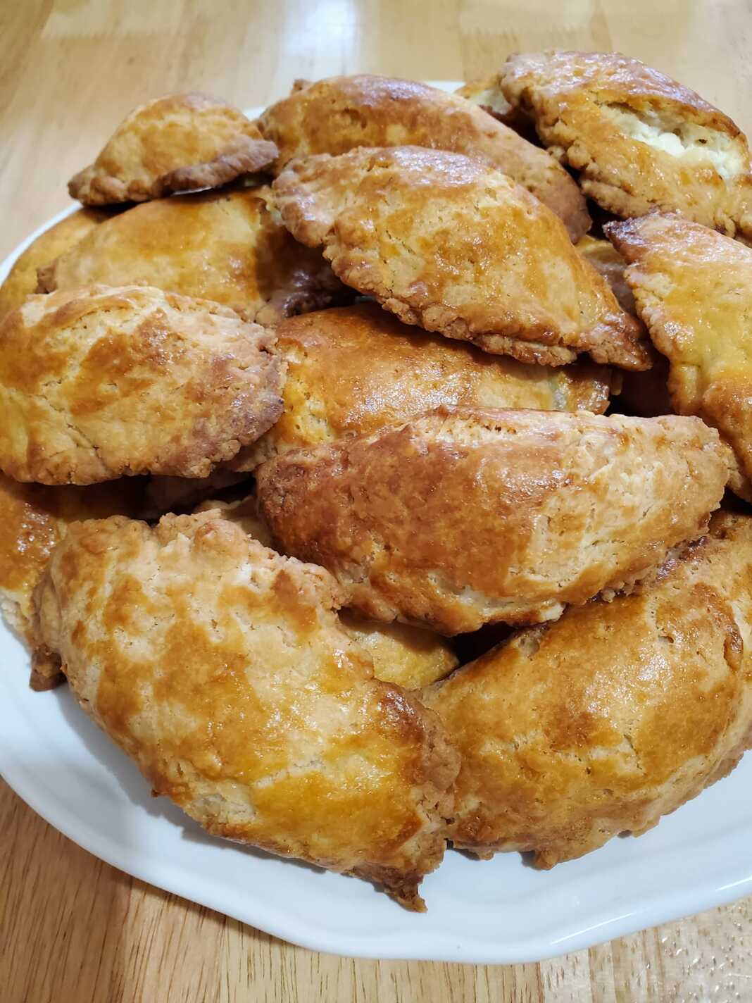 Τοποθετούμε στο καθένα στρογγυλό ζύμης ένα κουταλάκι του γλυκού γέμιση και κλείνουμε σα μισοφέγγαρο πατώντας καλά με τα δάχτυλα γύρω γύρω και με πιρουνι μετα.