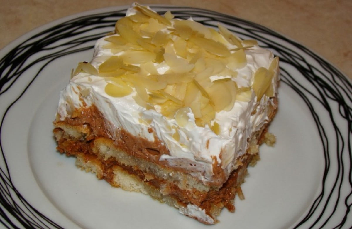 Τελειώνουμε με την υπόλοιπη κρέμα ζαχαροπλαστικής, από πάνω στρώνουμε την σαντιγί και γαρνίρουμε με αμύγδαλο φιλέ ή τρούφα ή τριμμένη σοκολάτα