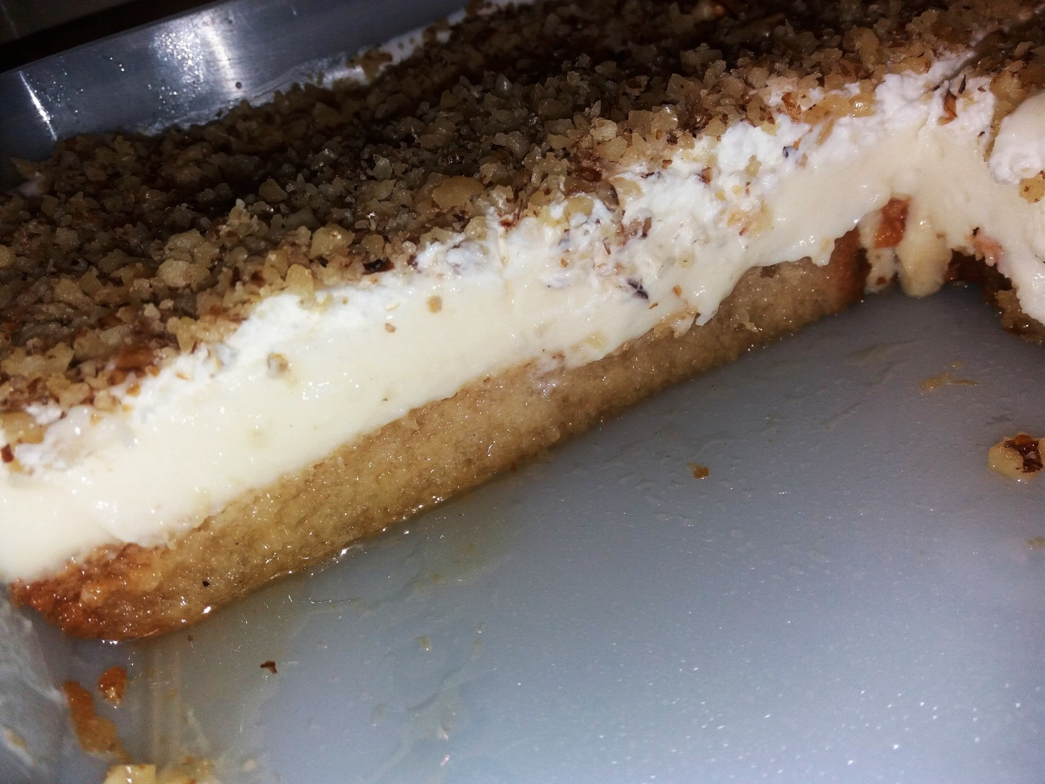 - Αφαιρούμε το ταψί από τον φούρνο και όπως είναι καυτή η βάση για το εκμέκ, ρίχνουμε από πάνω το κρύο σιρόπι με τη βοήθεια μιας κουτάλας, σιγά σιγά, φροντίζοντας το σιρόπι να πάει παντού.