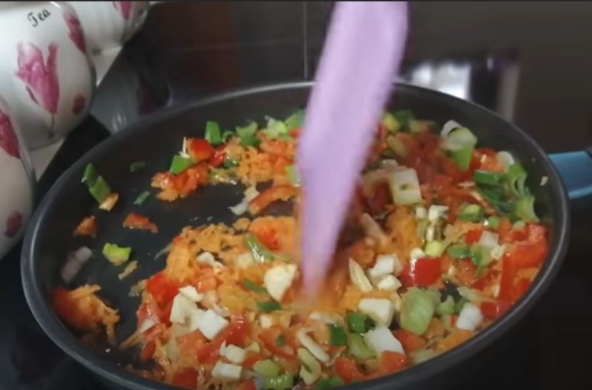 Σε ένα τηγάνι λιώνουμε την μαργαρίνη και ρίχνουμε το κρεμμυδάκι,καρότο,πιπεριά και τα σοταρουμε, επίσης ρίχνουμε και το σκόρδο.