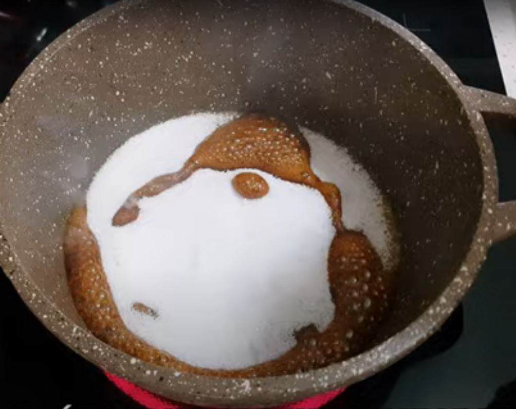 Σε μία κατσαρόλα που την βάζουμε σε μεσαία φωτιά προσθέτουμε την ζάχαρη, όταν αρχίζει να λιώνει και να καίγεται