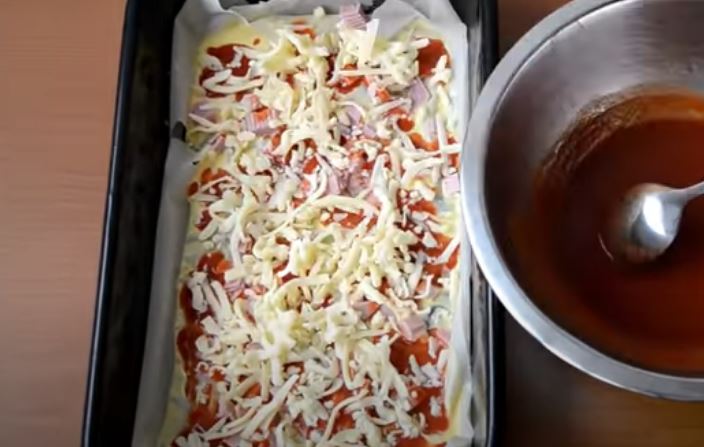 Σε ένα μικρό ταψάκι, ρίχνω λίγο λάδι και βάζω το πρώτο φύλλο κρούστας διπλωμένο, ή δύο φύλλα αν το ταψί είναι μεγαλύτερο. Αλείφω το φύλλο με τον χυλό αυγού που έχω φτιάξει και ρίχνω πάνω του ζαμπόν, σάλτσα πίτσας και τυρί.