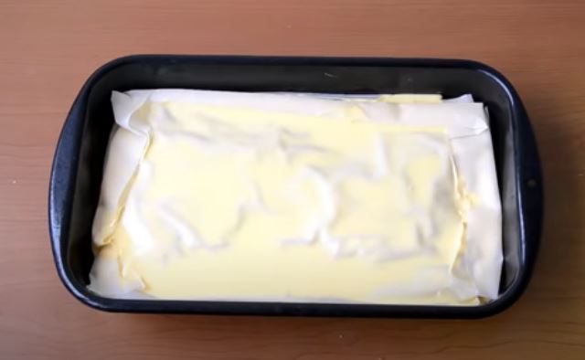 Αυτή τη διαδικασία την επαναλαμβάνω 4 φορές. Την 5η φορά, σκεπάζω μόνο με ένα φύλλο διπλωμένο και από πάνω ρίχνω τον χυλό αυγών που περίσσεψε.