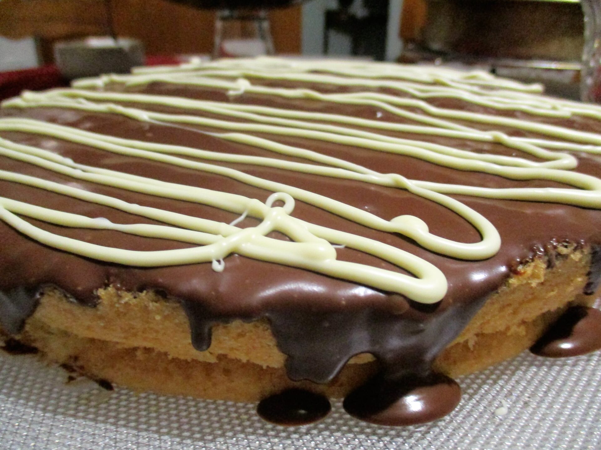 Και ολοκληρώνουμε την τούρτα μας , παίρνουμε το ένα μέρος από το παντεσπάνι το σιροπιάζουμε, απλώνουμε την κρέμα ( την οποία δουλεύουμε λίγο με το μίξερ βγάζοντας την από το ψυγείο να αφρατέψει) και τελειώνουμε με το δεύτερο παντεσπάνι , σιροπιάζουμε και αυτό και απλώνουμε την γκανάζ, ( λιώνουμε σε Μπεν μαρι την κουβερτούρα και προσθέτουμε την κρέμα γάλακτος δουλεύουμε με το σύρμα να ομογενοποιηθούν προσθέτουμε και μια κουταλιά σπορέλαιο και αφού κρυώσει περιχύνουμε την τούρτα , την βάζουμε στο ψυγείο, για για μερικές ώρες και γαρνίρουμε με λευκή σοκολάτα , αφού την λιώσουμε σε μπεν μαρί ( θα κρυώσει λίγο και μετά γαρνίρουμε)