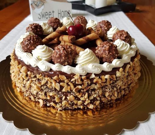Καλύπτουμε τα πλαϊνά με ψιλοκομμένα φουντούκια. Από πάνω ρίχνουμε τη σαντιγί και ενδιάμεσα βάζουμε μπαλάκια ferrero rocher.