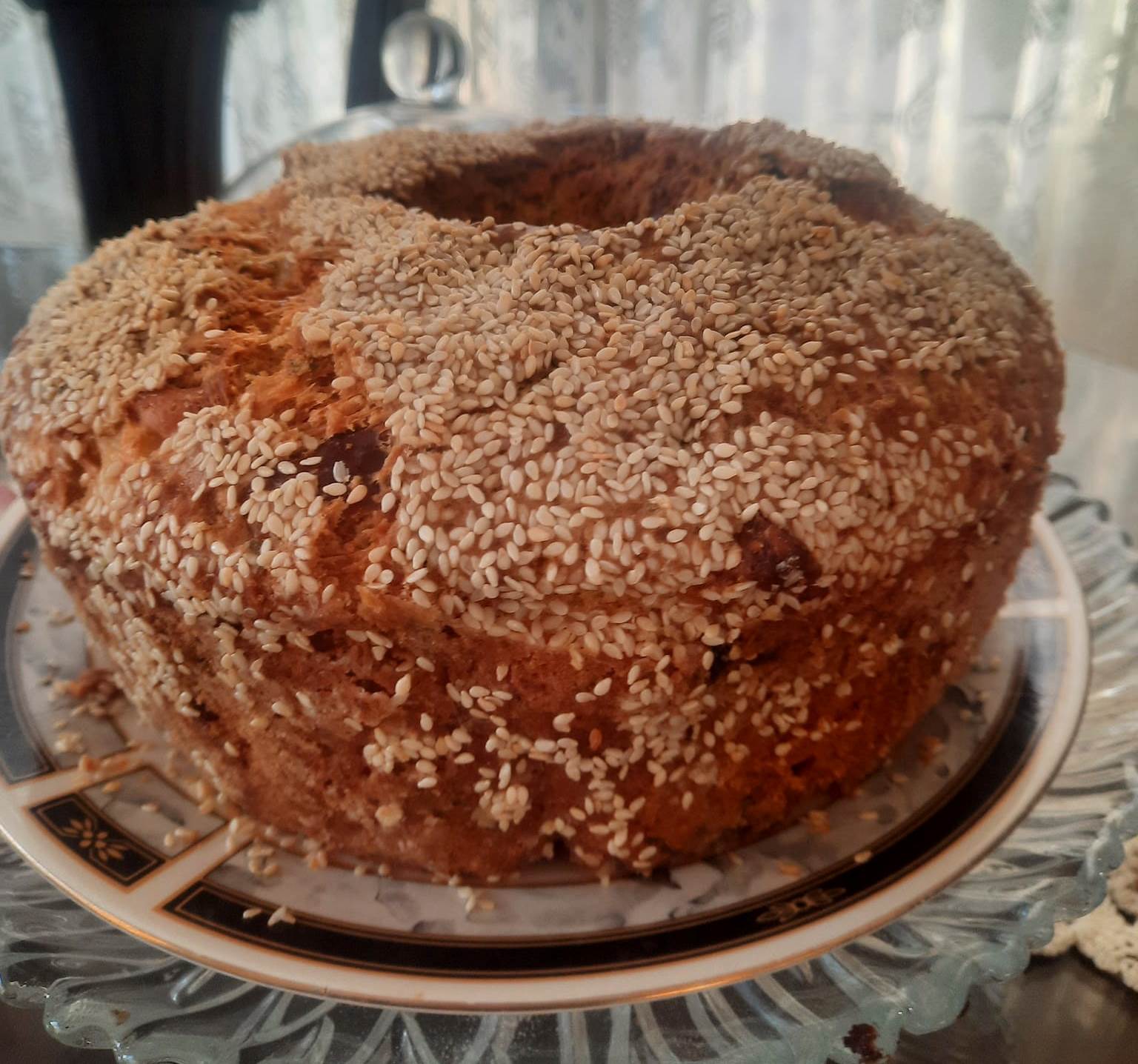Ρίχνω το μείγμα στο ταψί και πασπαλίζω με τον υπόλοιπο ξηρό δυόσμο και το σουσάμι. Ψήνω για 45-50 λεπτά, μέχρι η φλαουνόπιτα να ροδίσει.