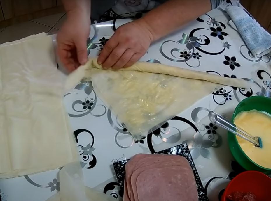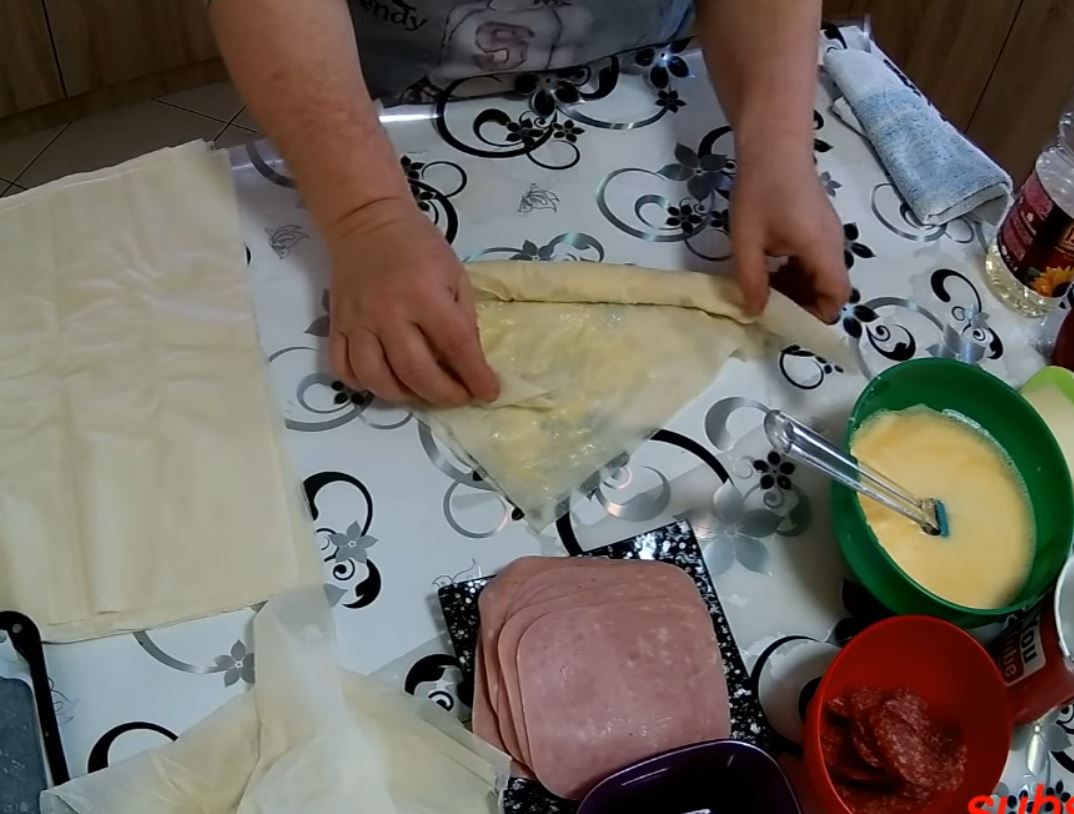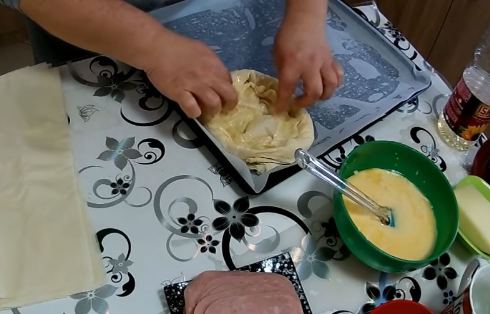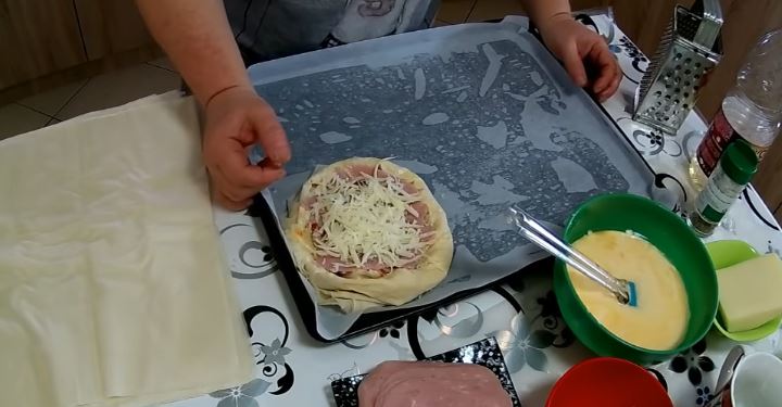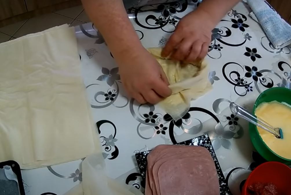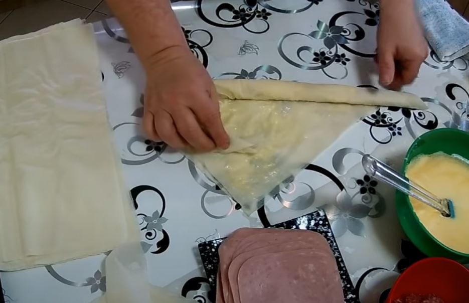 Στρώνουμε 3 φύλλα και τα αλείφουμε με το μείγμα αυγού ενδιάμεσα και πάνω από το τρίτο φύλλο