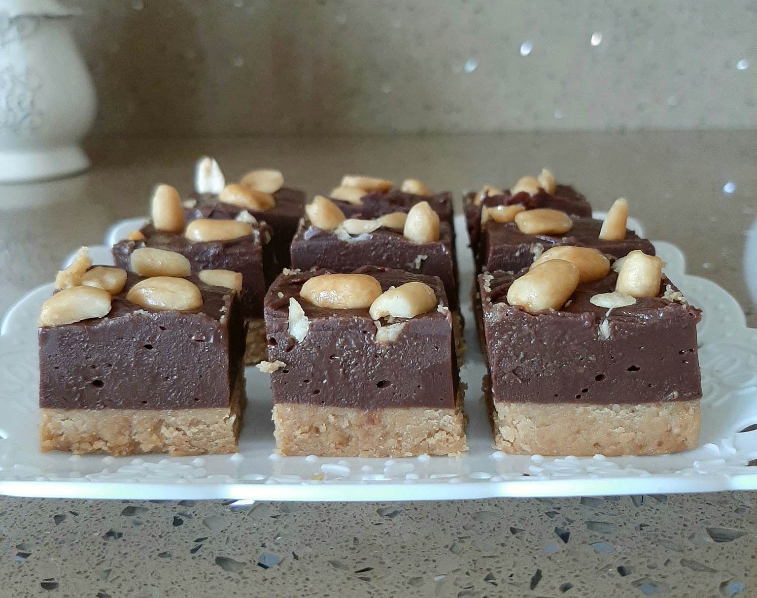 Για τη δεύτερη στρώση, λιώνουμε τη σοκολάτα γάλακτος και τη μαύρη σοκολάτα με το βούτυρο σε μπεν μαρί, προσθέτουμε το ζαχαρουχο γάλα, ανακατεύουμε όλα γρήγορα, ρίχνουμε το μείγμα στην προηγούμενη στρώση και τα ισιώνουμε καλά. Καλύπτουμε την επιφάνεια με μια στρώση αλατισμένα φιστίκια και βάζουμε το ταψί στο ψυγείο να ξεκουραστεί για τουλάχιστον έξι ώρες.